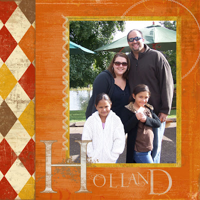 I now have a favorite alpha brush set to use for my digital scrapbooking! Since I just started, and only spend a few dollars a month on digital supplies, I really appreciate freebies! Can I handle the fact that my favorites are 9 times out of 10 freebies like Gennifer Bursett's Dinner Fairy alphabet brush set?  I used it to write out our Family Name Holland! The best part of digital scrapbooking? I can re-color and re-size all of the elements, photos and even the letters. I am going to switch things up a bit in the next day or two. I would like to remove the stitching I have on this layout and change the color of the alphas to see if I can improve this layout. I made it in just 30 minutes after the kiddies went to bed and I was done watching Jay Leno!